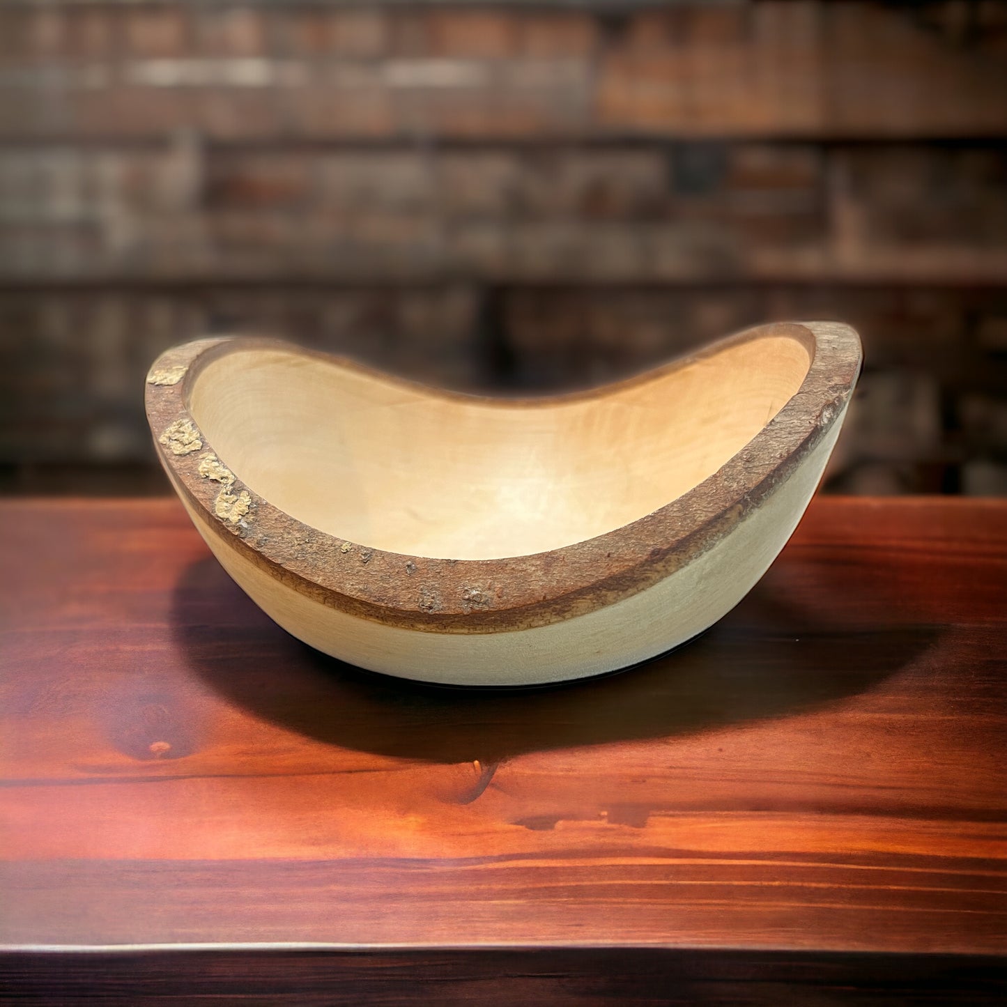 Small live edge birch bowl. The oblong top measures 7" x 6" and roughly 2.75" deep interior. This bowl was turned green and will have a little movement in the wood.